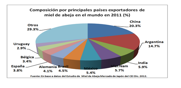 China históricamente ha sido el principal productor de miel de abeja en el mundo con una participación de 22% de la producción mundial y es el primer exportador mundial (20.3%), seguido de Argentina (14.7%), India (5.9%), Viet Nam (5.7%), México (5.4%) y Brasil (4.5%). Estos países en conjunto representan el 56.5% del total de la exportaciones mundiales de miel de abeja en 2011.