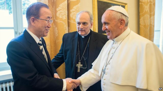 Tras reunirse con el papa Francisco, Ban aseguró en ese evento que "mitigar el cambio climático y adaptarse a sus efectos es necesario para erradicar la extrema pobreza, reducir la desigualdad y garantizar un desarrollo económico equitativo y sostenible".
