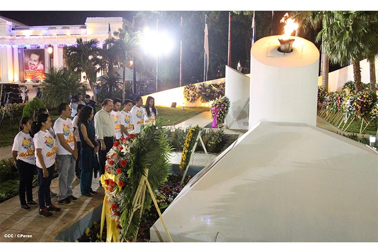 Desde esta Plaza, Plaza que recoge toda una Historia de Lucha, de Heroísmo de nuestro Pueblo y, con esta Juventud, esta pequeña Delegación de la Juventud. Porque Tomás está, como Carlos, como Sandino, como Santos López, está en el Corazón de tod@s l@s Jóvenes nicaragüenses.