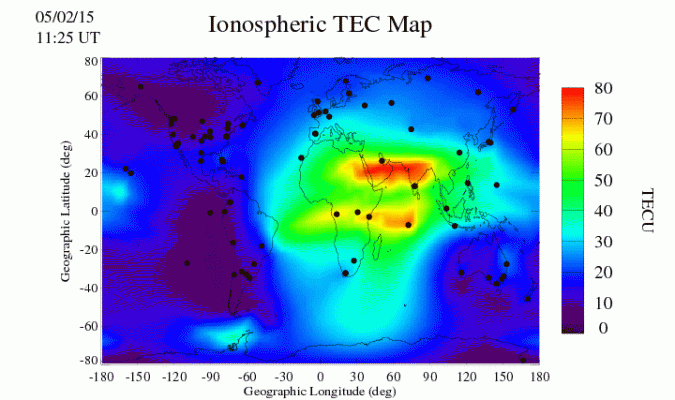 A su vez el Mapa global de la ionosfera, elaborado po el Laboratorio de Propulción del Instituto tecnológico de California de la NASA, en su contenido del 2 de mayo, muestra un total de electrones (TEC ) de tiempo real (RT) destacado sobre las zonas del terremoto. Los valores son observados mediate un sistema GPS de cartografía, con datos recogidos desde estaciones terrestres.