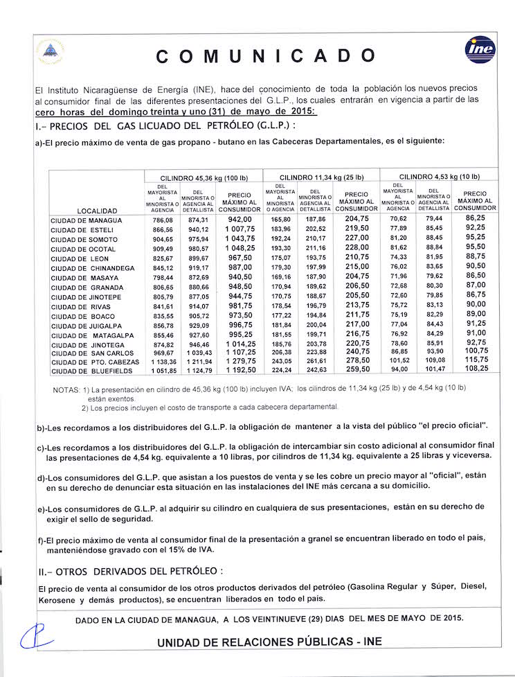 En el caso del cilindro de 25 libras, esta pasa de C$214.50 a C$204.75, con una reducción de 9.75 córdobas.