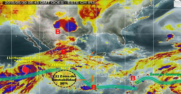 El huracán Andrés, primer meteoro de la temporada 2015 en el Pacífico, se mantiene en la categoría 1 en la escala Saffir-Simpson la mañana de este sábado y se ubica al sur-suroeste de Cabo San Lucas, Baja California Sur e Isla Socorro, Colima, en México.