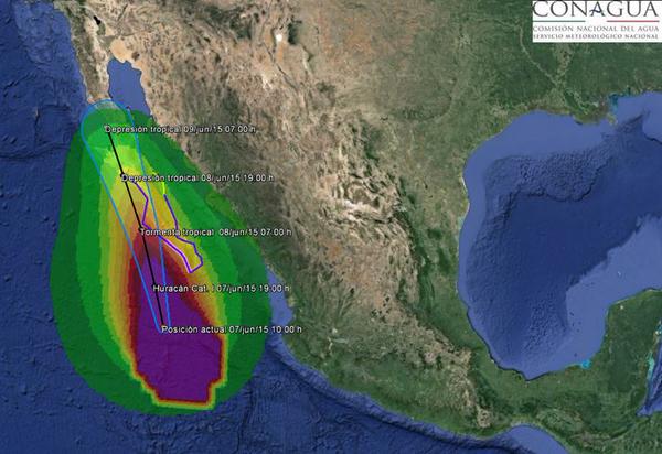 El SMN estableció una zona de vigilancia por efectos de huracán de Cabo San Lucas a Santa Fe, en Baja California Sur, y un área de prevención por tormenta tropical de Loreto a Punta Abreojos, en el mismo estado.
