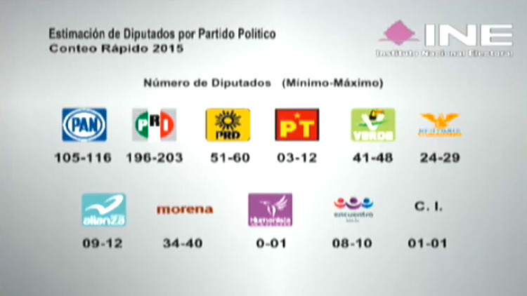 Según los resultados del conteo rápido que ha anunciado el Instituto Nacional Electoral (INE), el PRI lidera las elecciones intermedias con entre el 29,87% y el 30,85% de los votos, y obtendría entre 196 y 203 escaños en la Cámara de Diputados.