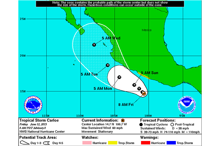 La tormenta tropical Carlos se movía lentamente el jueves en aguas del océano Pacífico, amenazando con convertirse en huracán el viernes por la noche frente a las costas de México, dijo el Centro Nacional de Huracanes de Estados Unidos (CNH).