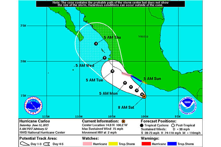 El Centro Nacional de Huracanes de Estados Unidos, con sede en Miami, dijo que el vórtice de Carlos se encontraba a las 10:00 am hora del centro de México a unos 225 kilómetros (140 millas) al sur de Acapulco, y que tenía vientos máximos sostenidos de 120 kph (75 mph).