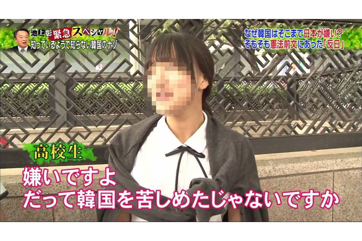 Entre los entrevistados, aparece una colegiala, que, de acuerdo a los subtítulos (en japonés), dijo, “odio a Japón porque atormentó a Corea”.