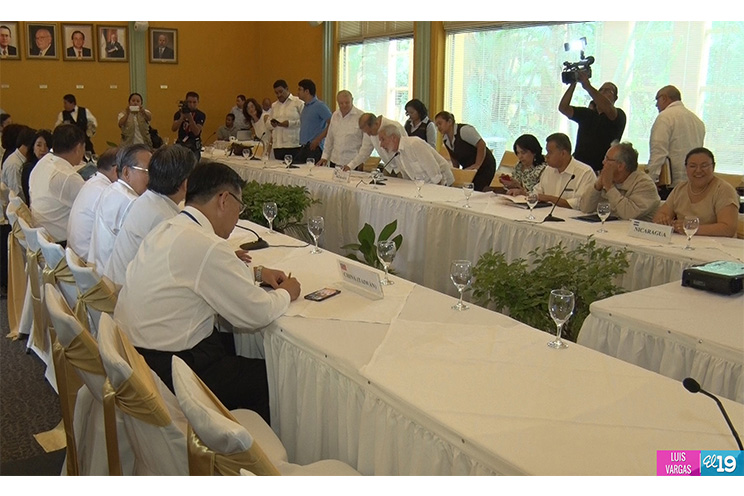 El Salón de las Banderas del Ministerio de Relaciones Exteriores fue el lugar donde empresarios y diputados de la República de China-Taiwán, se reunieron con una delegación del Gobierno Sandinista de Nicaragua, compuesta por el Canciller Samuel Santos y el asesor en temas de inversiones General (R) Álvaro Baltodano.