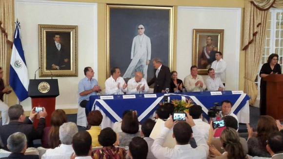 El secretario general del Frente Farabundo Martí para la Liberación Nacional (FMLN), Medardo González, y parte de la Comisión Política del partido de izquierda entregaron la Medalla del Mérito Farabundo Martí a los cinco antiterroristas cubanos.