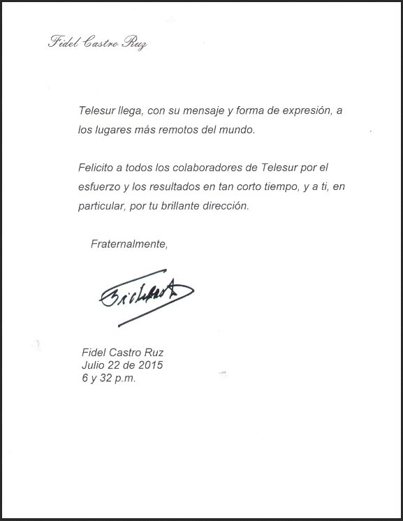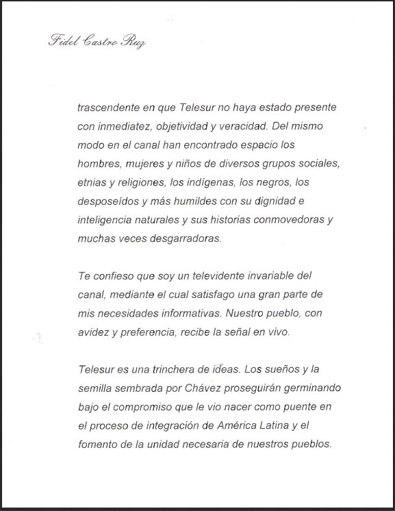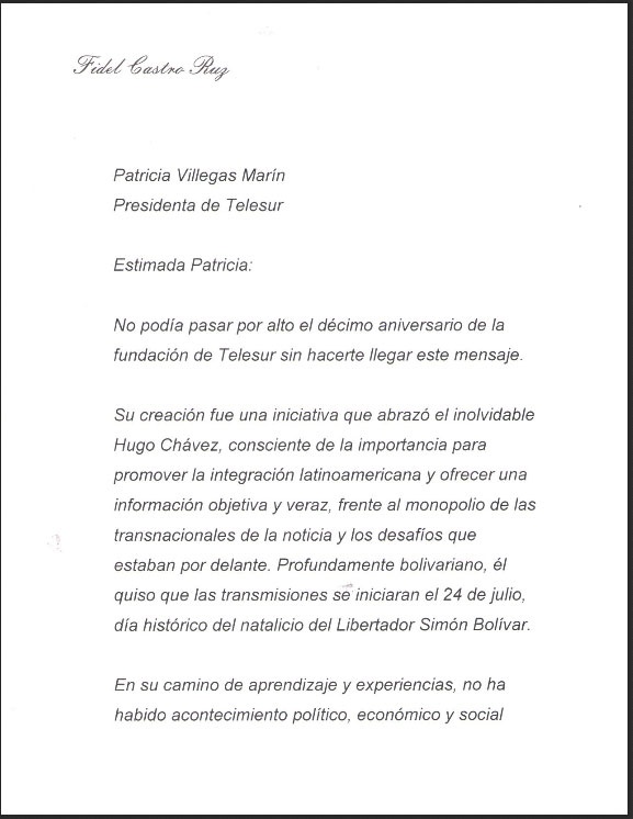 “...No ha habido acontecimiento político, económico y social trascendente en que teleSUR no haya estado presente con inmediatez, objetividad y veracidad...” escribió el líder de la Revolución Cubana, Fidel Castro, en una misiva extendida a teleSUR en el marco de nuestro décimo aniversario este 24 de julio.