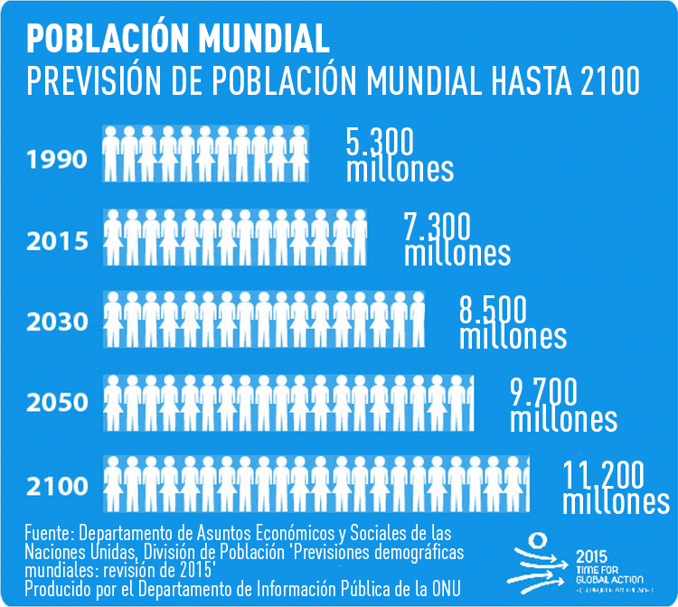 De acuerdo con el reporte de la ONU se prevé que en el año 2100 la población de la Tierra aumente de los actuales 7.300 millones de personas a 11.200 millones. Además, ya en el año 2050 aproximadamente 9.700 millones de habitantes vivirán en nuestro planeta.