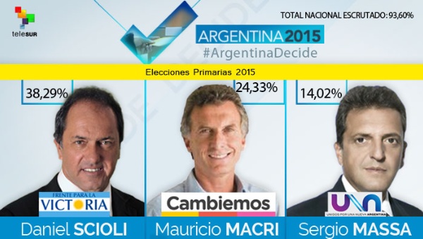 Al cierre de la votación en las Primarias Abiertas Simultáneas y Obligatorias (PASO) de Argentina, las tendencias de algunos sondeos nacionales marcaron que Daniel Scioli, del Frente para la Victoria, fue el candidato más votado con una ventaja superior a los 10 puntos respecto a su contendiente más cercano, Mauricio Macri, y seguido en tercer lugar por Sergio Massa.
