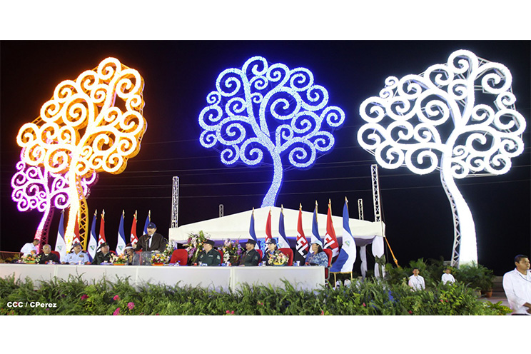 Comandante Daniel Ortega Saavedra, Presidente de la República y Jefe Supremo del Ejército de Nicaragua; Coordinadora del Consejo de Comunicación y Ciudadanía, Compañera Rosario Murillo Zambrana; General de Ejército Julio César Avilés Castillo, Comandante en Jefe del Ejército de Nicaragua; Mayor General Oscar Mojica Obregón, Jefe del Estado Mayor General