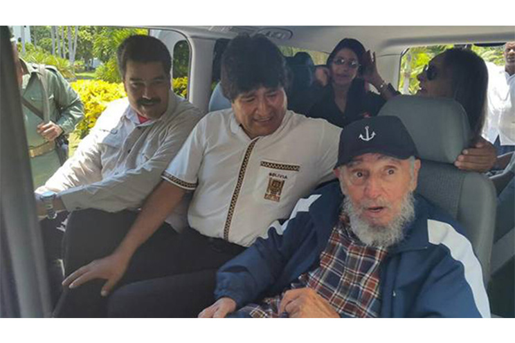 El líder cubano Fidel Castro y el presidente de Venezuela, Nicolás Maduro, sorprendieron este jueves al mandatario boliviano, Evo Morales, al visitarle en el hotel donde se hospeda en La Habana, informó la agencia estatal boliviana ABI.