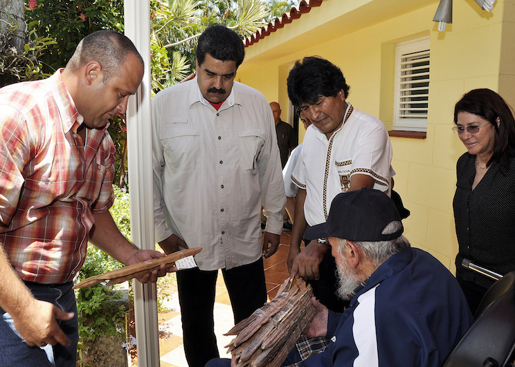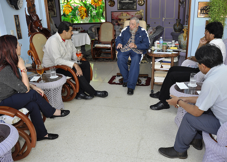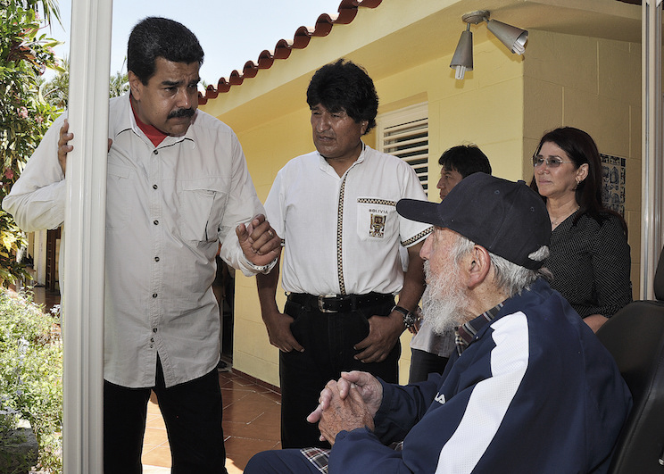 Fidel y Maduro acudieron juntos al hotel La Laguna de la capital cubana, donde se hospeda el mandatario boliviano, quien fue sorprendido por los visitantes.