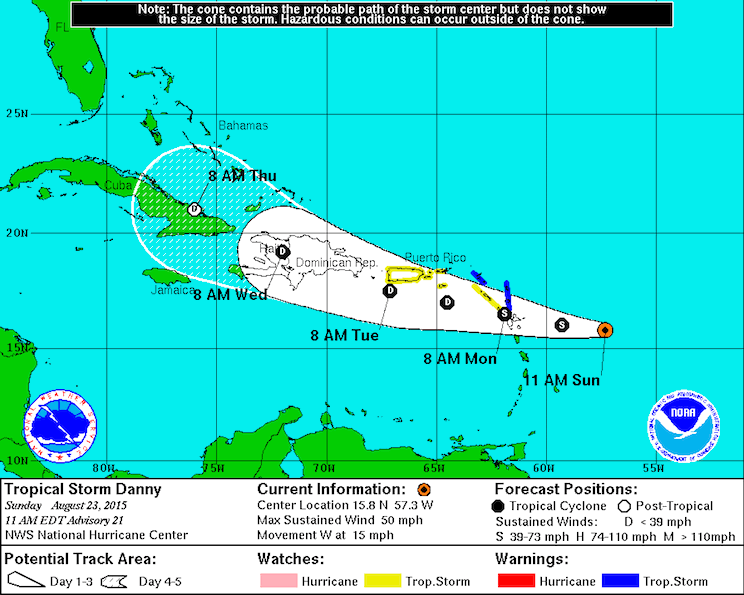 El instituto meteorológico precisó que Danny se halla a 510 kilómetros (315 millas) al este de la isla de Guadalupe y a 565 kilómetros (350 millas) al este-sureste de Antigua y se desplaza a una velocidad de 24 kilómetros por hora (15 millas por hora).
