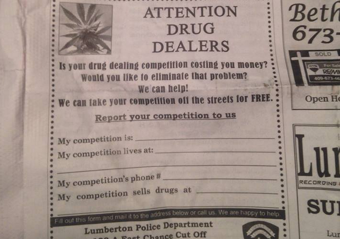 La policía de Lumberton, Texas, publicó un curioso anuncio en un periódico local, ofreciendo a los traficantes de drogas “ayuda” para deshacerse de sus competidores.