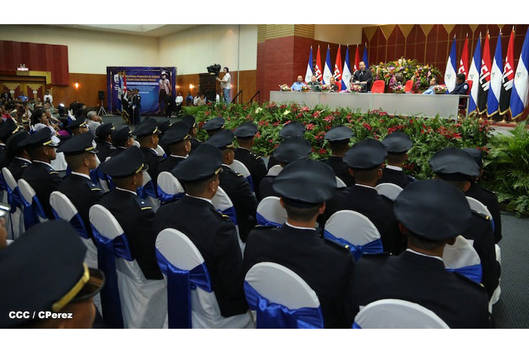 Se integran a una Institución con 36 Años de Historia y de Victorias, sellada con la Sangre de centenares de Hombres y Mujeres. Pasan a formar parte hoy de la Policía Nacional de Nicaragua, una Policía distinta a las otras Policías, yo diría, Única, cuya Identidad está íntimamente vinculada a sus Orígenes Revolucionarios: Cercana a la Comunidad, trabajando con ella y por ella, para su Tranquilidad.