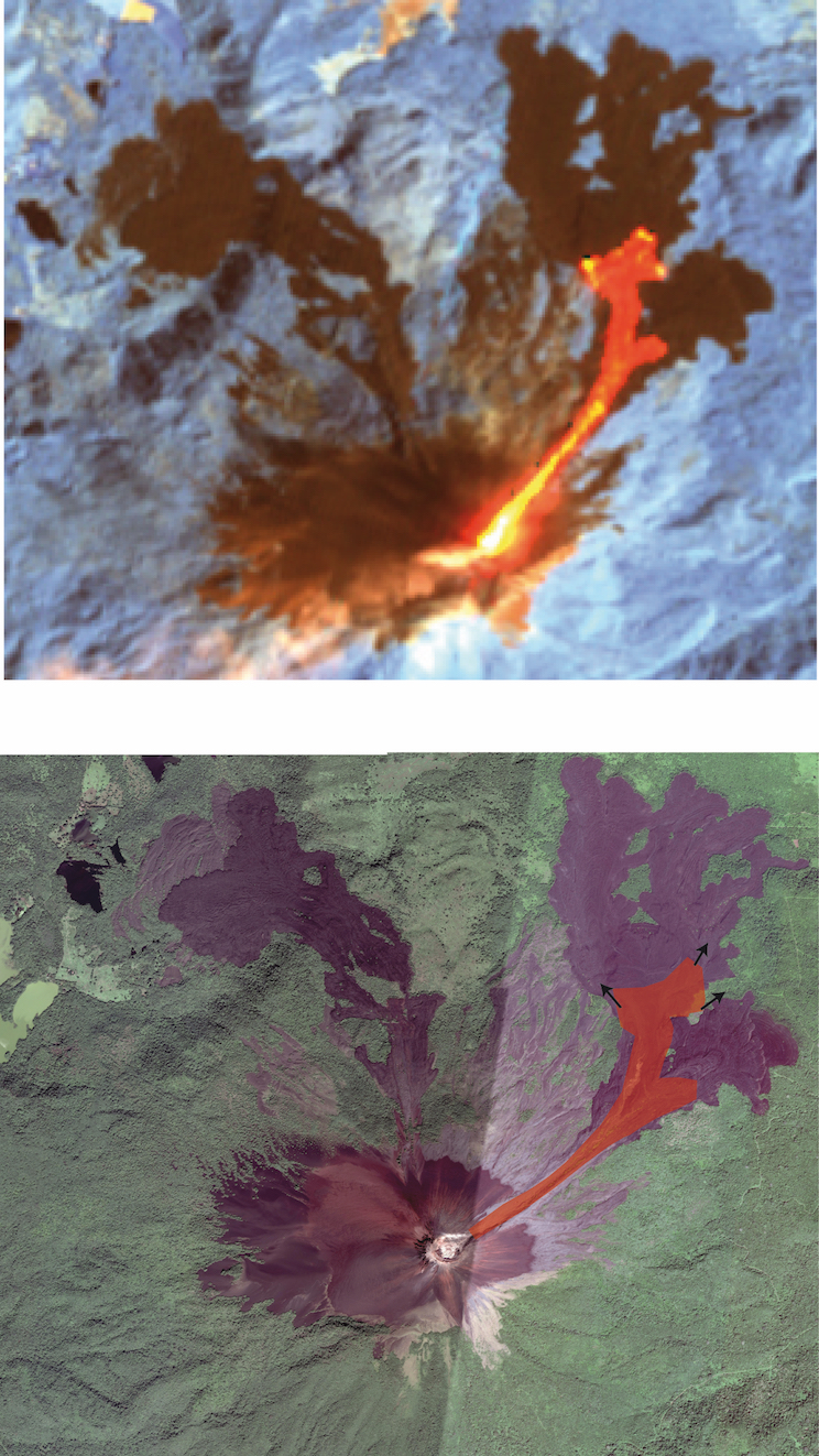Además, se observan las huellas de la lava que han sido expulsadas por el volcán en erupciones anteriores, incluyendo la erupción de 1905 (color púrpura).