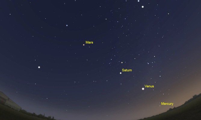 Alrededor de una hora, más o menos, antes del amanecer: Mercurio, Venus, Marte, Júpiter y Saturno, los cinco planetas que se han observado desde épocas antiguas, aparecerán alineados extendidos desde lo alto del norte, hacia abajo en el este.