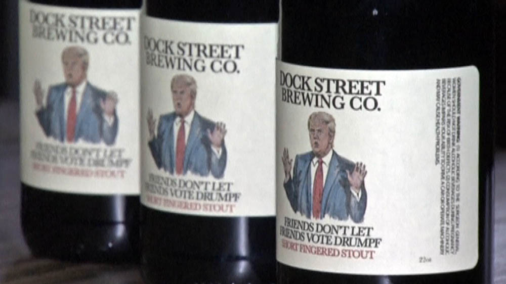 La campaña lleva por lema "Los amigos no dejan que sus amigos voten por Drumpf", en referencia al apellido original de la familia del multimillonario neoyorquino, según anunció la cervecería Dock Street Brewery en su web oficial.