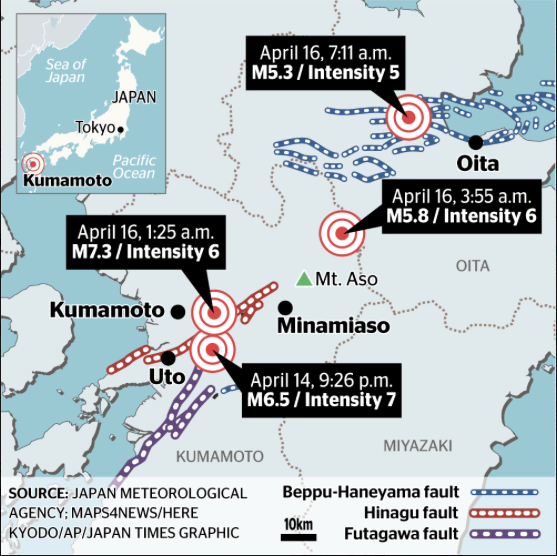 Técnicamente, los terremotos se producen no sólo en la "región de Kumamoto" en el sur de la prefectura de Kumamoto, sino también en la región de Aso, en el norte de Kumamoto, y en la Prefectura de Oita.