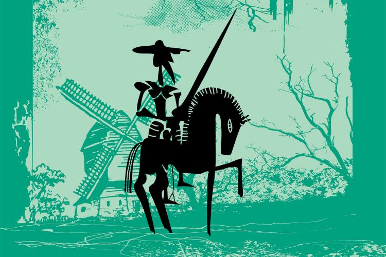 A don Quijote nunca lo movería a tomar su adarga antigua semejante anglicismo. Él iría con su Rocinante a cabalgar si Sancho, en una de esas, cuando “sale con unas discreciones que le levantan al cielo”, se lo dijera en perfecto español, aunque se dirigieran a desfacer tuertos a tierras de habla portuguesa: