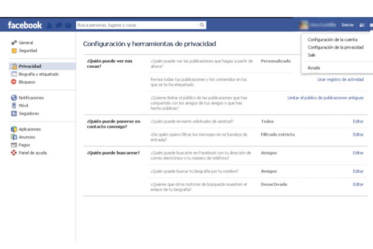 Desde el panel de ajustes de Facebook, en la sección de Privacidad puedes configurar quién puede ver tus cosas, quién puede ponerse en contacto contigo, y quién puede buscarte. Estos ajustes permiten dar acceso a tu contenido a cualquier persona, sólo a los amigos, o hacerlos privados de forma que sólo tú puedes ver tus publicaciones, fotos y dónde te etiquetan.