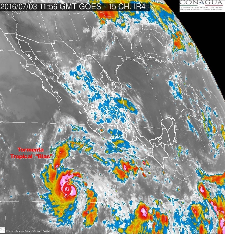 El Servicio Meteorológico Nacional informó que la tormenta tropical Blas, en el Océano Pacífico, al suroeste de las costas de Colima y Jalisco, reforzará el potencial de lluvias puntuales muy fuertes a intensas en el occidente y sur del país.