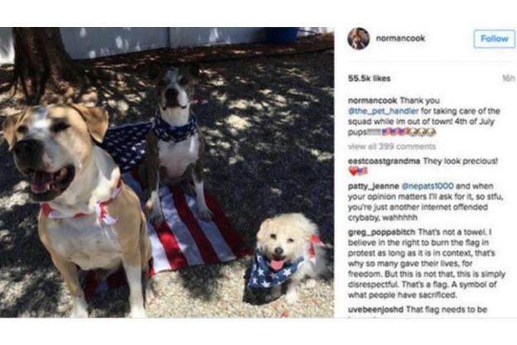 Mientras que dos de los perros portan un pañuelo con los colores de la bandera estadounidense, otro está sobre una bandera en el suelo, lo que molestó a los seguidores de Cuoco, pues le dejaron comentarios como: “Pensé que amabas a tu país, pero no es amor si le faltas al respeto a la bandera poniéndola en el suelo. Déjame recordarte que mucha sangre fue sacrificada para tener esa bandera en alto”.