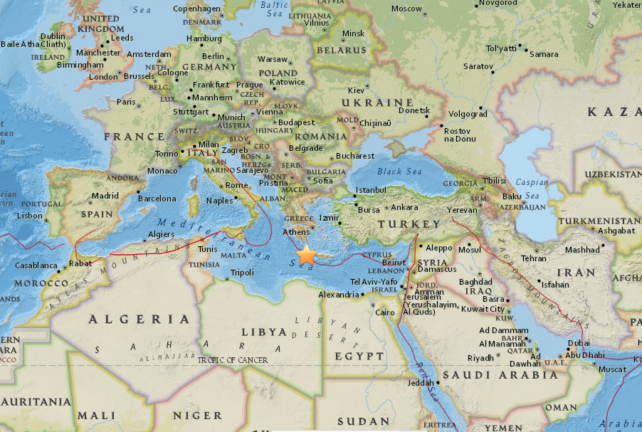 El epicentro del sismo fue registrado a las 17.26 (GMT) a unos 63,5 kilómetros al suroeste de la localidad griega de Vryses, en el oeste de la isla de Creta, a una profundidad de nueve kilómetros.