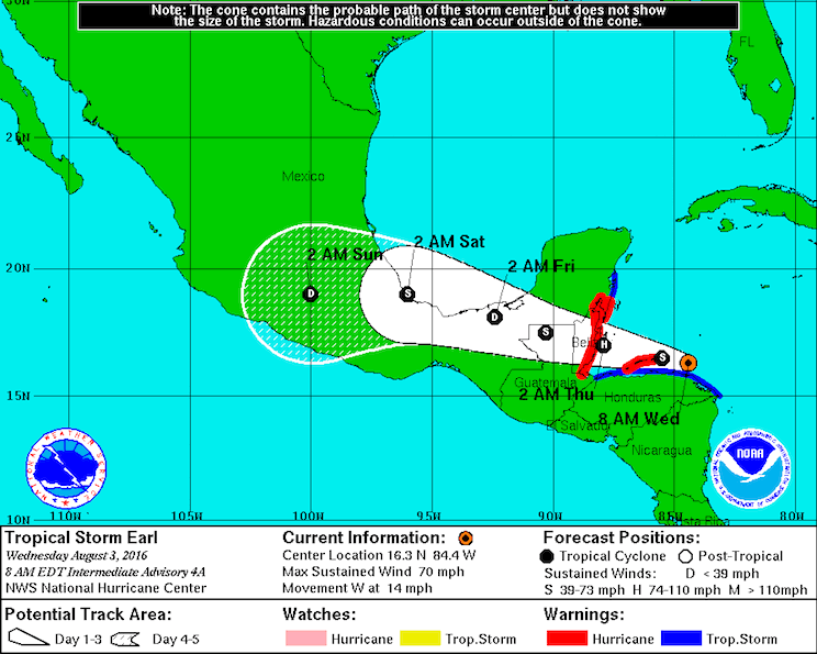 El Servicio Meteorológico Nacional (SMN) de México espera que dentro de las próximas horas Earl evolucione a huracán categoría 1 y se sitúe a 118 millas al sur-sureste de Puerto Costa Maya, Quintana Roo.
