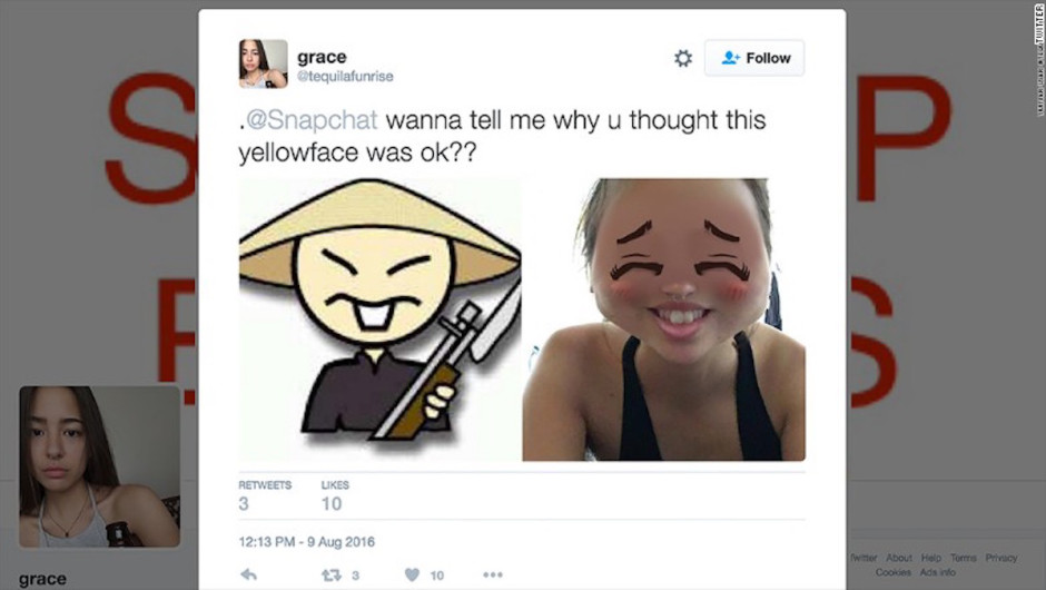 La aplicación móvil de mensajería Snapchat retiró rápidamente un filtro para fotografías, que los internautas utilizaban para crear estereotipos racistas de los asiáticos y que se ganó el mote de "Yelow face" (cara amarilla).