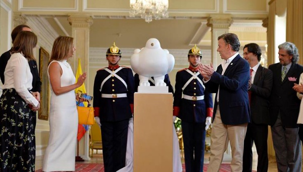 Durante la presentación de la escultura, el presidente colombiano agradeció al artista por inspirar a los colombianos a decirle sí al fin de la guerra.