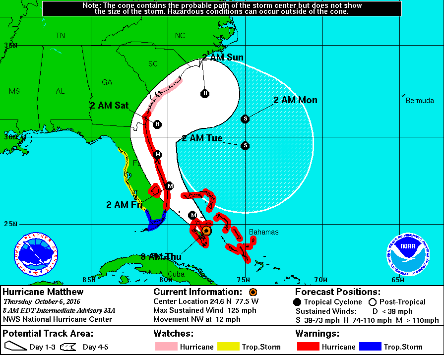El huracán Matthew, que se dirige a azotar el este de Florida en las próximas horas, mantuvo esta mañana vientos de 125 millas por hora.