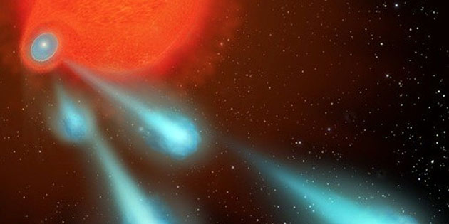 Al entrar la compañera en la atmósfera exterior de la estrella hinchada, ésta engulle material que se asienta en un disco alrededor de la compañera, y sirve como plataforma de lanzamiento para las masas de plasma. Este sistema estelar puede ser la explicación para la enorme variedad de formas que Hubble ha venido detectando en torno a estas estrellas moribundas y que ha sido bautizada como nebulosa planetaria.