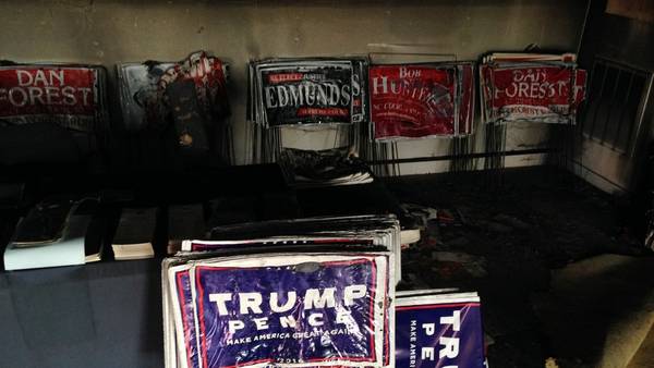 El lanzamiento de una botella con líquido inflamable a través de una ventana de la oficina republicana en el condado predominantemente demócrata de Orange (Carolina del Norte) quemó muebles, materiales y carteles de campaña, aunque no provocó heridos, según la Policía local.