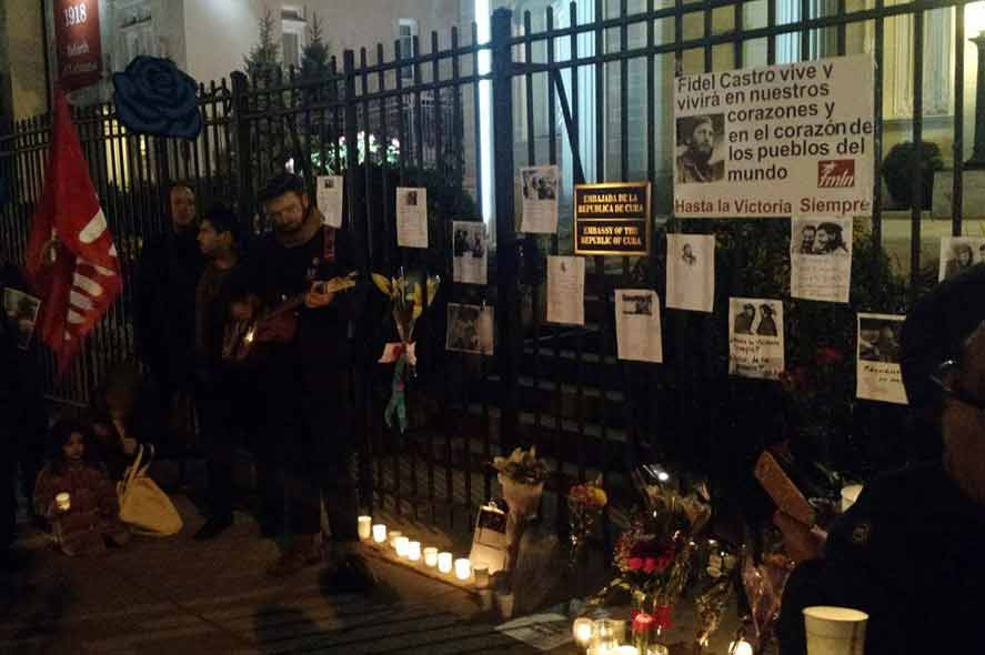 Grupos de solidaridad con Cuba se reunieron hoy frente a la embajada de la isla en esta capital, para expresar sus condolencias por el fallecimiento del líder histórico de la Revolución cubana, Fidel Castro.