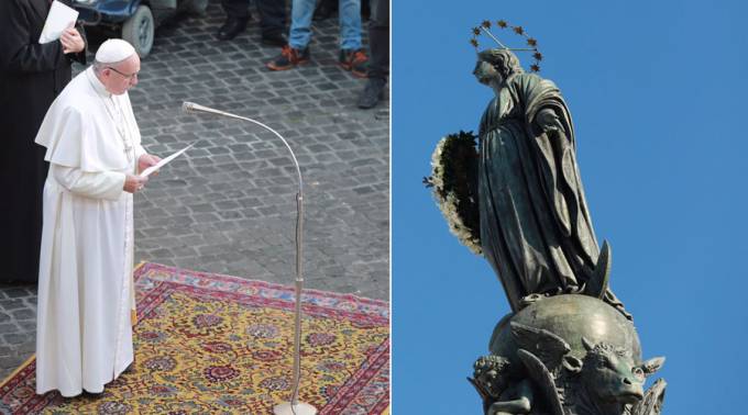Como es tradición cada 8 de diciembre, el Papa Francisco acudió a la popular Plaza de España en Roma para el acto de veneración de la Inmaculada Concepción de María, fiesta que se celebra hoy.