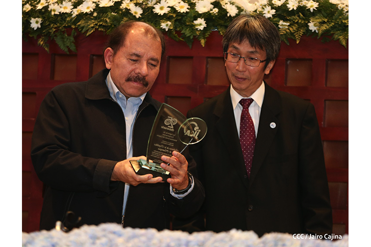 Bueno, he recibido este Reconocimiento, fíjense, me han entregado este Reconocimiento en el 25 Aniversario de la Agencia de Cooperación, ¿y qué podemos decir de este Reconocimiento? Es un Reconocimiento al Pueblo nicaragüense que ha sabido acoger la mano del Pueblo de Japón. Y estamos ya cerrando el Año del Centenario del Tránsito a la Inmortalidad de Rubén Darío, y quiero comunicarle a nuestro Hermano Vicepresidente del JICA, a Hidetoshi Irigaki, que le vamos a otorgar y le haremos llegar la Orden Rubén Darío en su Centenario, al JICA, como Instrumento de Paz y de Solidaridad con nuestro Pueblo.