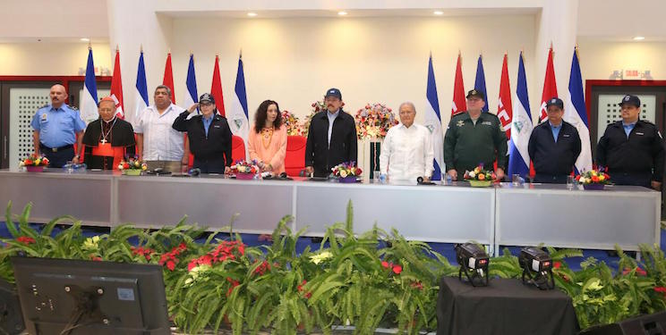 Comandante Daniel Ortega, Presidente de la República y Jefe Supremo de la Policía Nacional; Compañera Rosario Murillo, Coordinadora del Consejo de Comunicación Social y Ciudadanía, y Vicepresidenta Electa de la República de Nicaragua; Su Eminencia Reverendísima Cardenal Miguel Obando y Bravo; Compañero Salvador Sánchez Cerén, Presidente de la República Hermana de El Salvador.