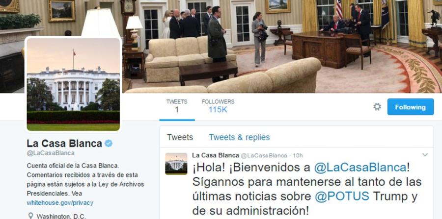 "Hola! ¡Bienvenidos a @LaCasaBlanca! Sígannos para mantenerse al tanto de las últimas noticias sobre @POTUS Trump y de su administración!", publica hoy la cuenta en twitter de la Casa Blanca en su primer mensaje en español.