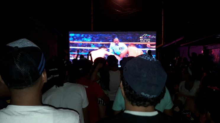 A traves de una pantalla Gigante, instalada en las afueras de la casa del "Chocolatito", las familias capitalinas disfrutan de la velada boxística que tiene como escenario el Madison Square Garden de Nueva York.