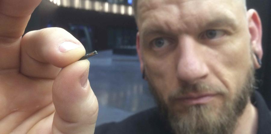 Una aguja se desliza entre el pulgar y el dedo índice. Con un rápido clic se introduce bajo la piel un pequeño chip.