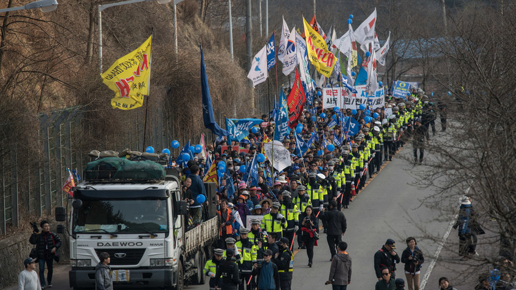 Ciudadanos surcoreanos se han enfrentado con las fuerzas policiales que acompañan al convoy de los radares y otros aparatos del THAAD.