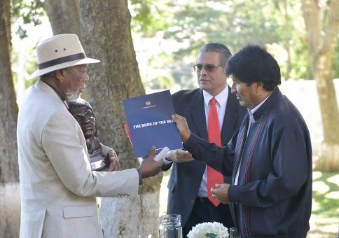 El presidente de Bolivia, Evo Morales, entregó este sábado al reconocido actor y director de cine estadounidense Morgan Freeman un ejemplar del 'Libro del Mar', en una reunión en la ciudad de Santa Cruz de la Sierra.
