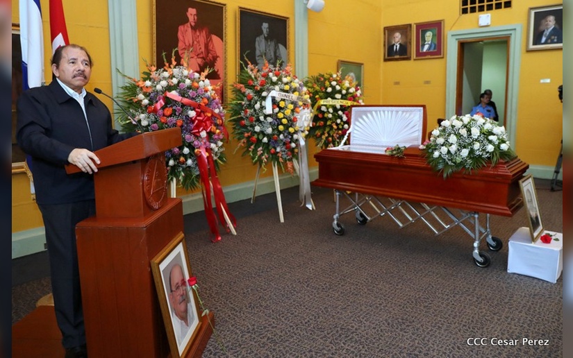 Herman@s nicaragüenses, este día, con las lluvias que traen la Vida, le decimos a Miguel, nuestro Hermano, que él, como la lluvia, ha sido Sembrador de Vida. Lo sabe muy bien parte de su Familia que aquí nos acompaña, y la otra parte de la Familia que se encuentra en Tierras lejanas, pero que están presentes también en esta tarde... En esta tarde en la que, a quien llamamos con toda Justicia, el Canciller de la Dignidad, de la Dignidad de Nicaragua, y desde esa posición, Defensor de la Dignidad de los Pueblos de Nuestramérica, y de los Pueblos del Mundo.