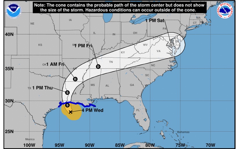 El miércoles por la tarde la tormenta se encontraba a 215 kilómetros (135 millas) al sur de Lake Charles en Luisiana y tenía vientos sostenidos máximos de 85 kilómetros por hora (50 millas por hora). Se activó una alerta de tormenta tropical en la costa desde el San Luis Pass en Texas hasta la boca del río Mississippi.