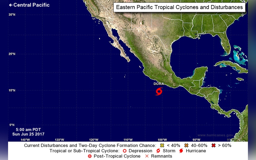 El vórtice de Dora se localiza a unos 265 kilómetros al sur-suroeste de la zona turística de Acapulco y se mueve hacia el oeste-noroeste a 19 kilómetros por hora con vientos máximos sostenidos de 65 kilómetros.