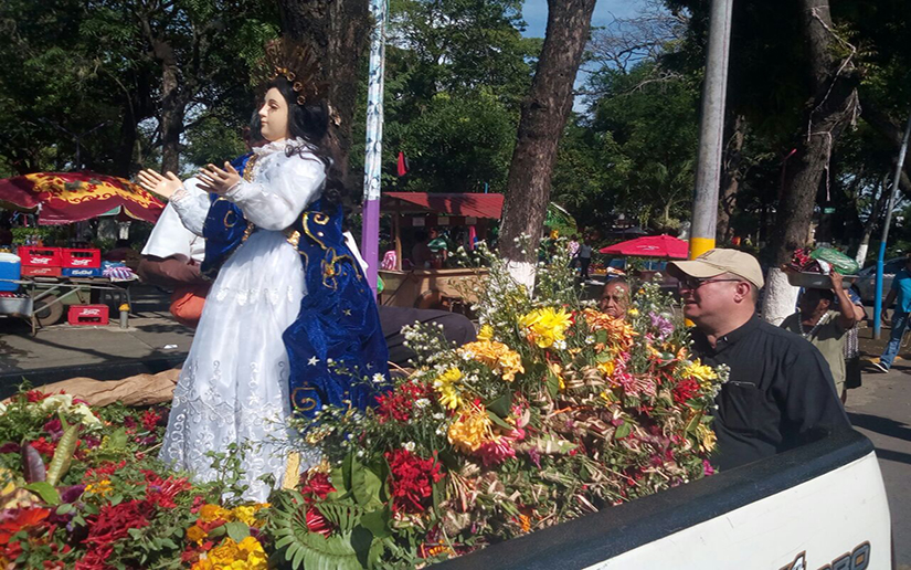 El Padre Bismark Conde, vicario foráneo, acompañado de feligreses católicos llevan las flores preparadas en los hogares de la comunidad Indígena de Monimbó en honor a la Madre de Jesús.